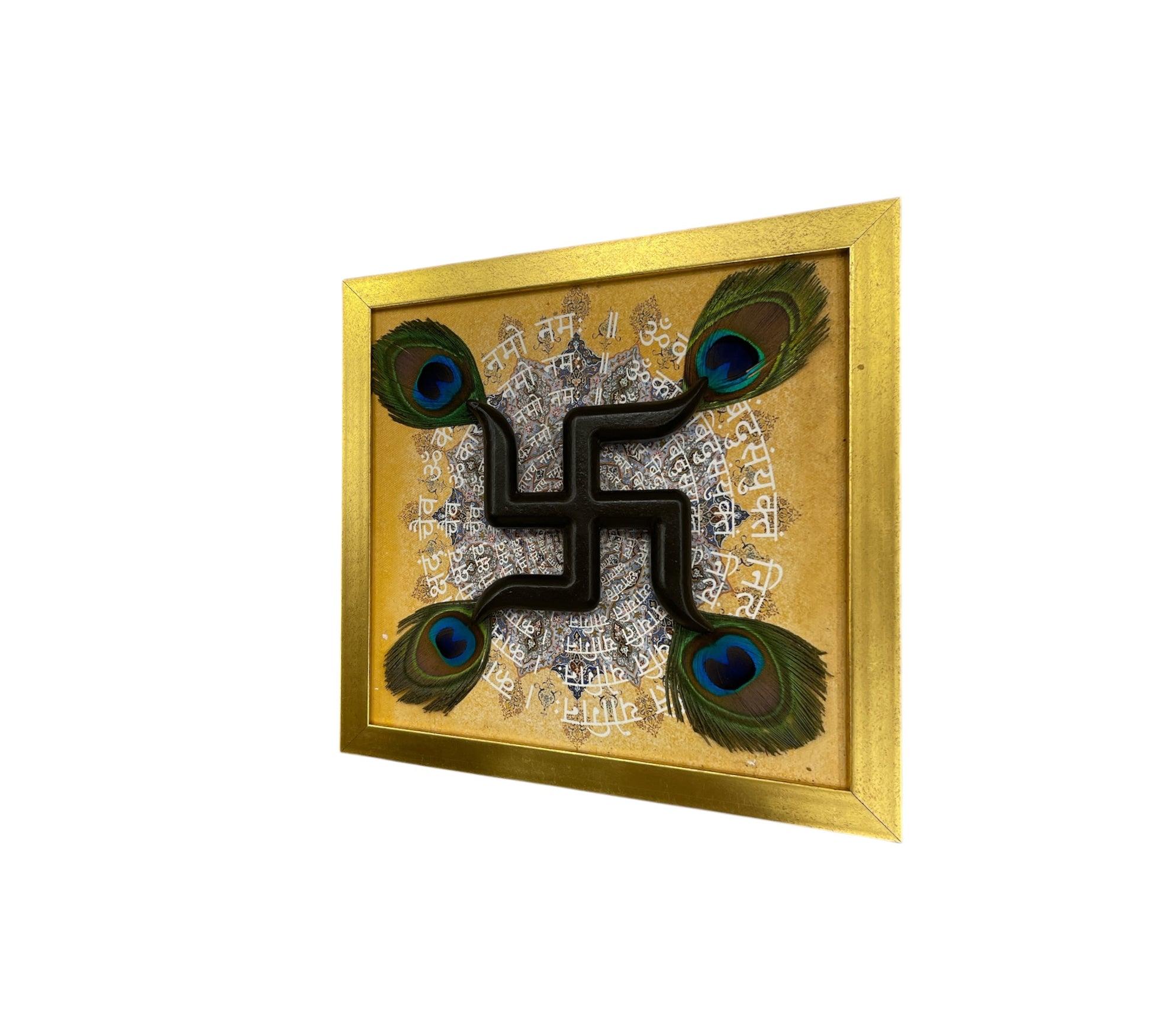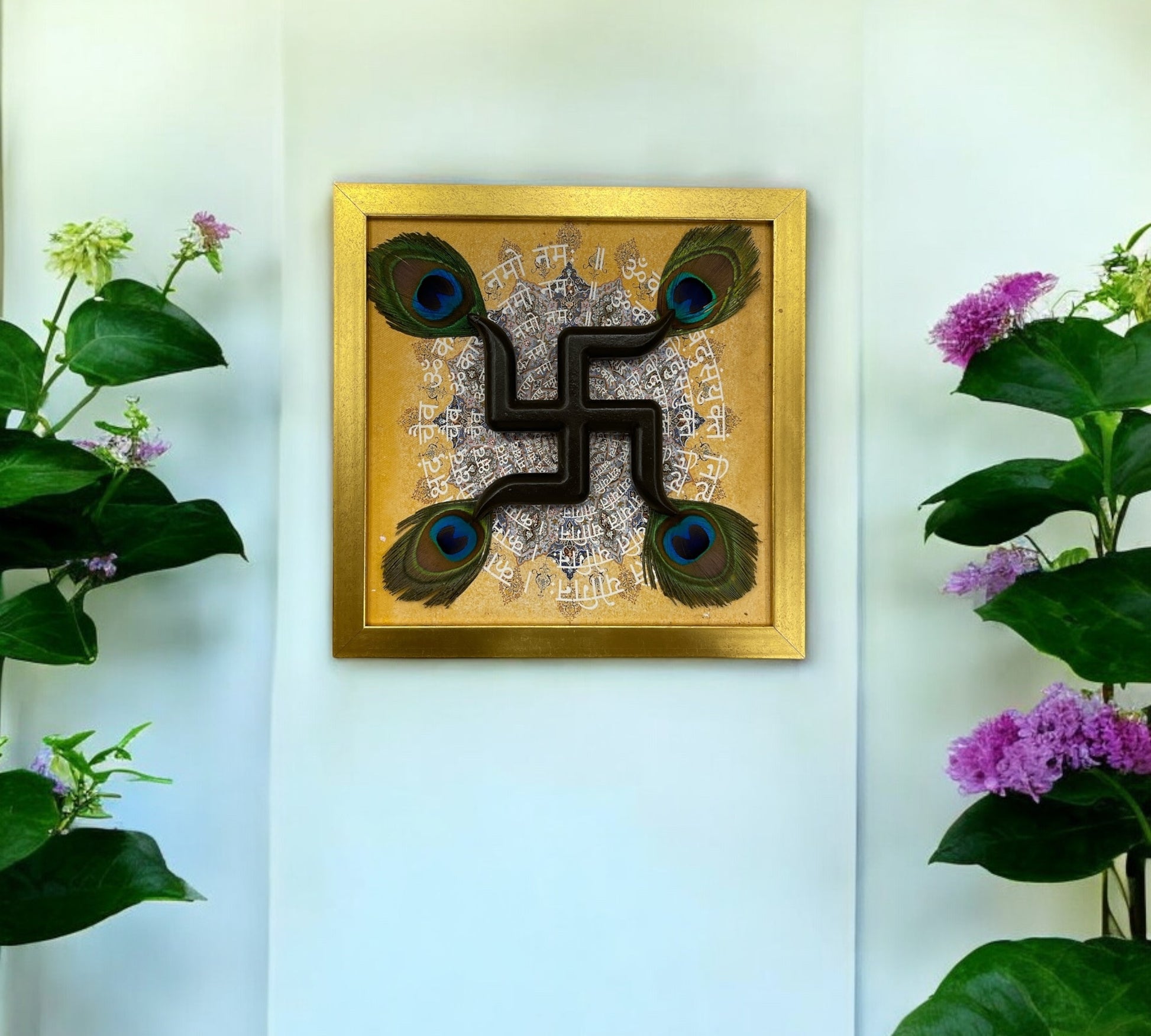 Wooden swastik with peacock feather & Mandala Backdrop in Gold frame