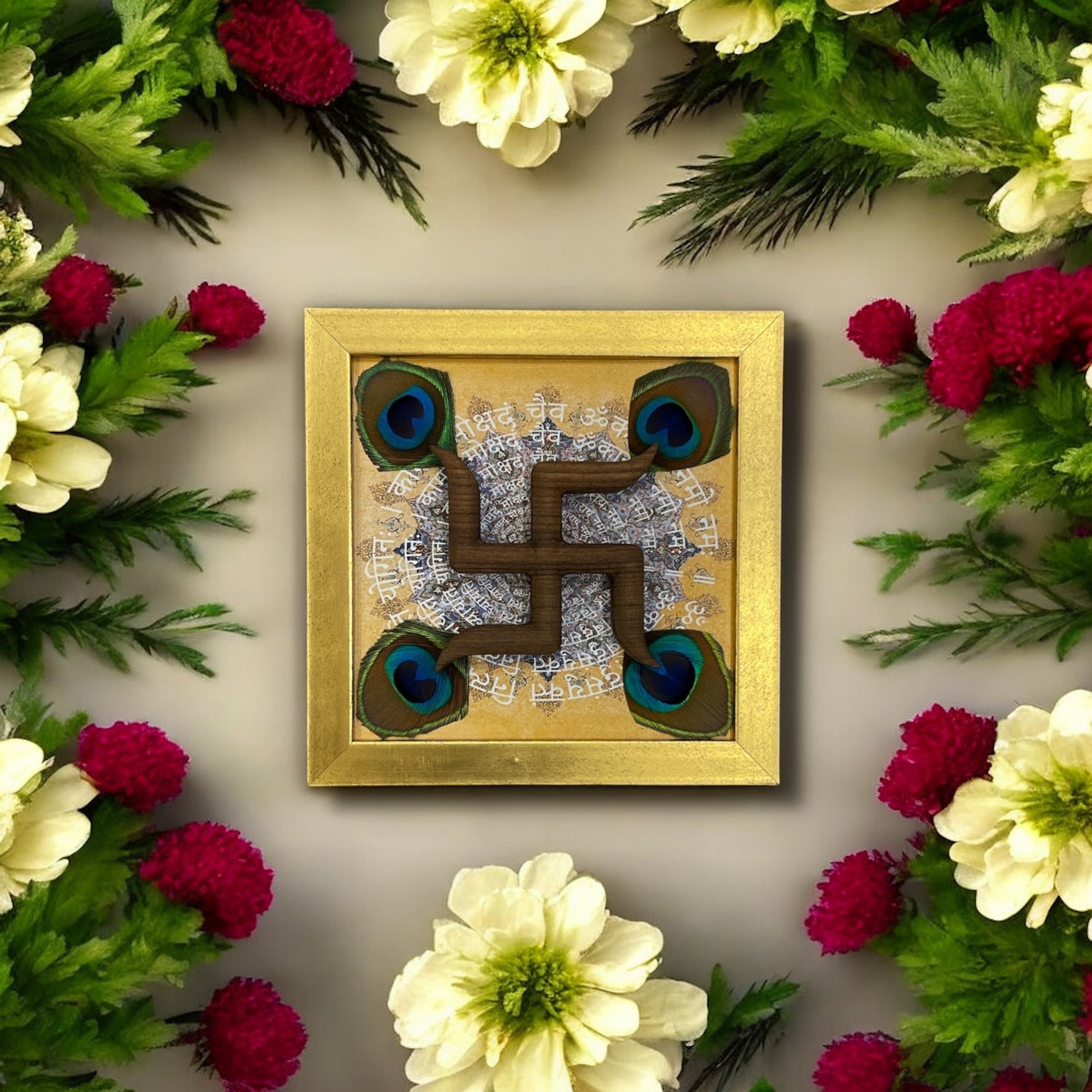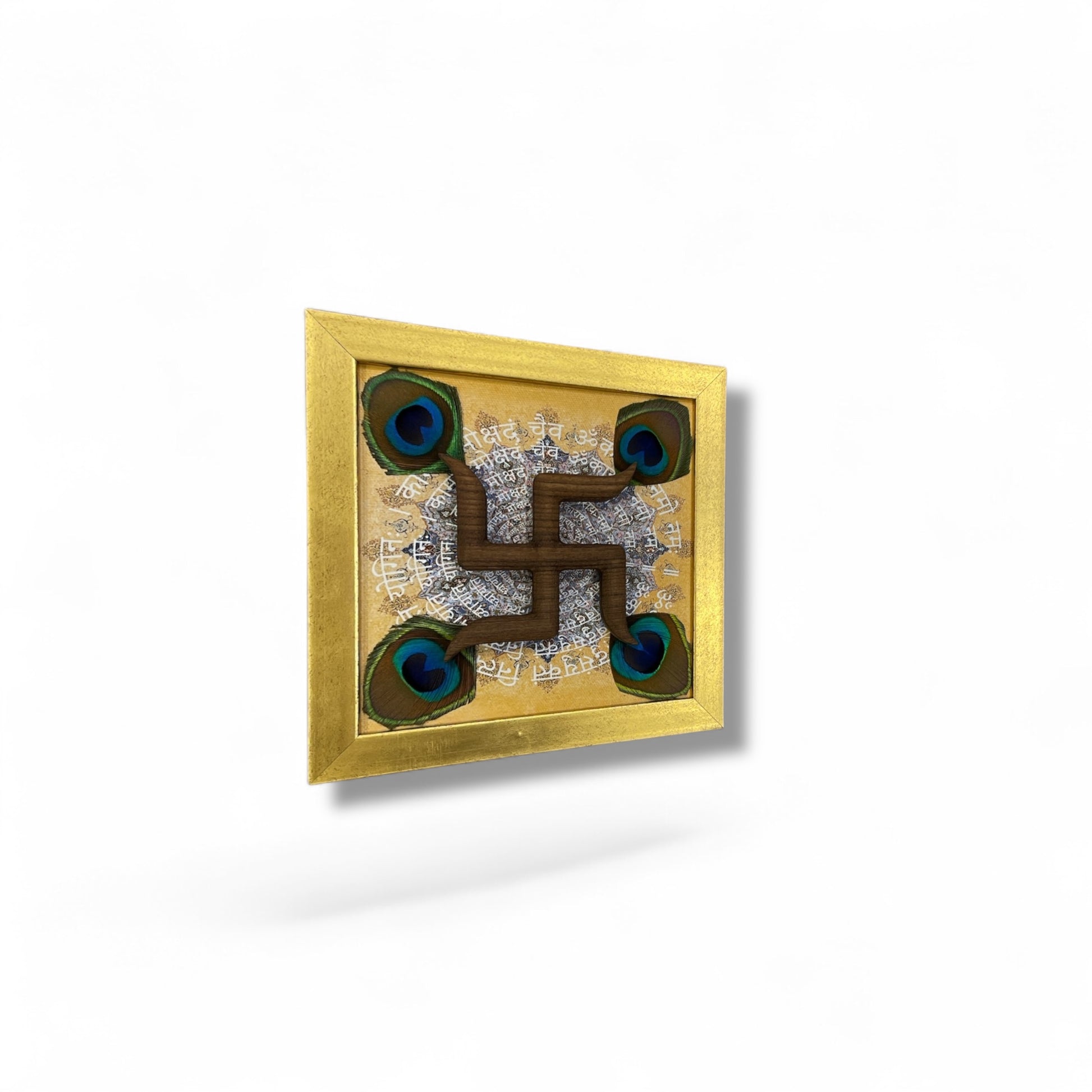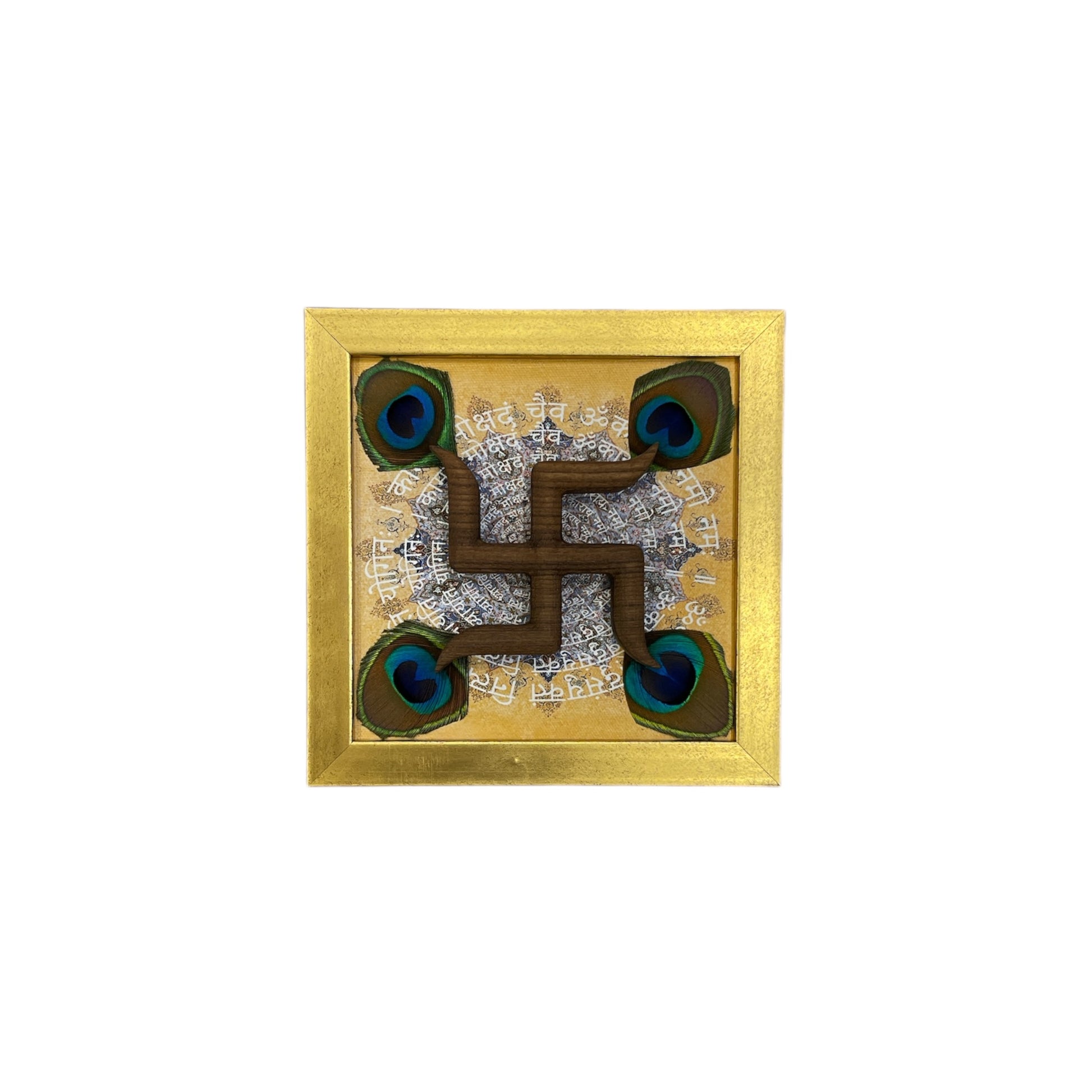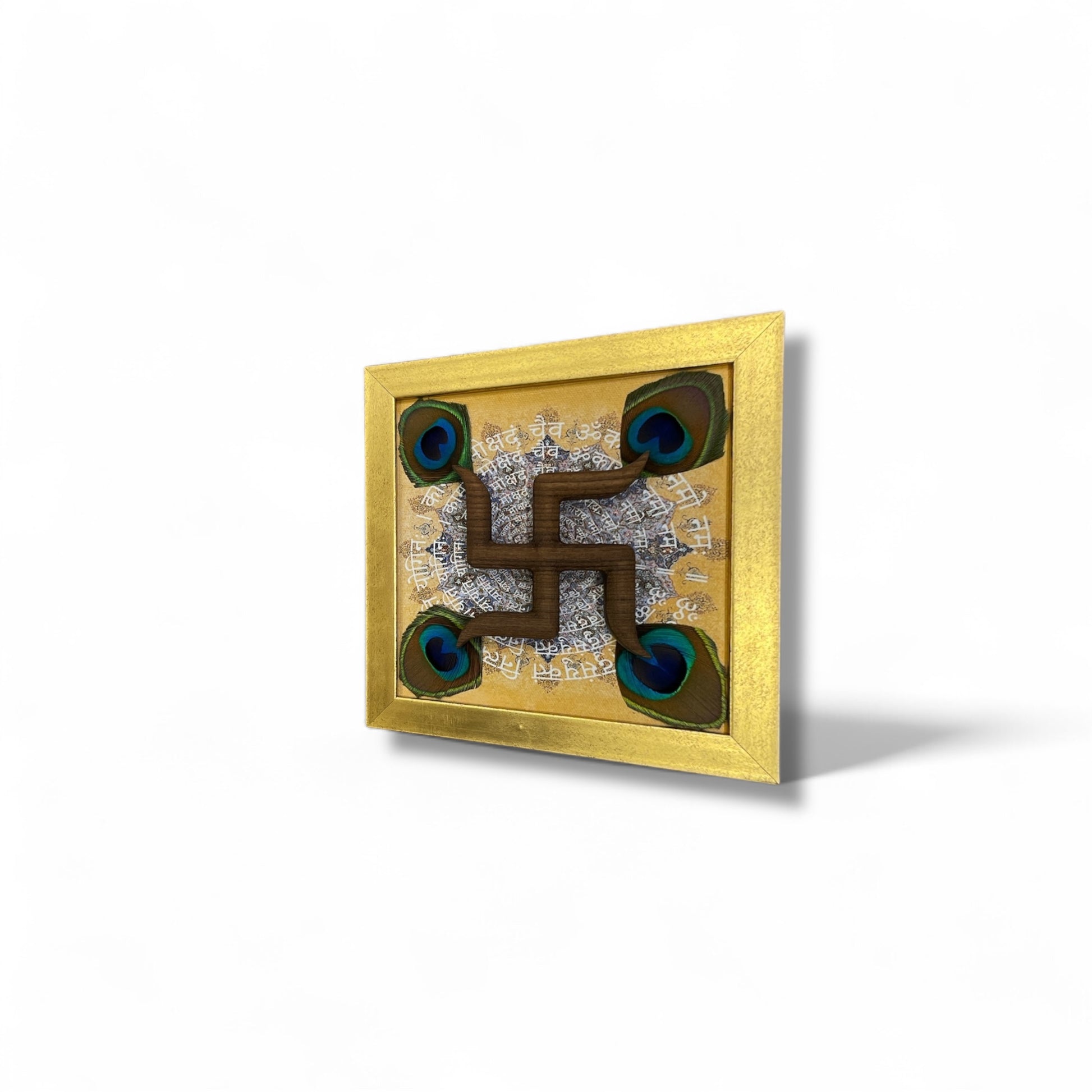 Wooden Swastik with Peacock Feathers on Omkara in Gold Frame